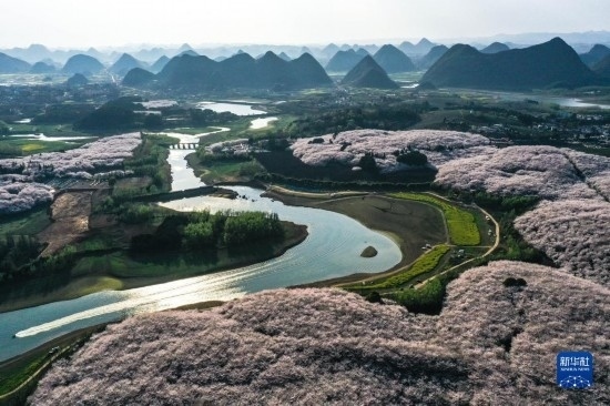 貴州省貴安新區(qū)櫻花園風(fēng)貌(3月21日攝,無(wú)人機(jī)照片)。