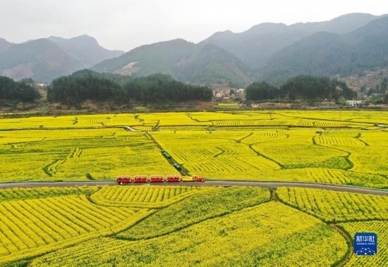 游客乘坐觀光小火車在貴州省貴定縣盤(pán)江鎮(zhèn)“金海雪山”景區(qū)觀賞油菜花海(3月12日攝,無(wú)人機(jī)照片)。