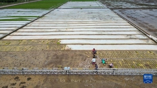4月20日,在彭山區(qū)公義鎮(zhèn),數(shù)智水稻示范基地內(nèi)的工人在田里育秧(無人機(jī)照片)。