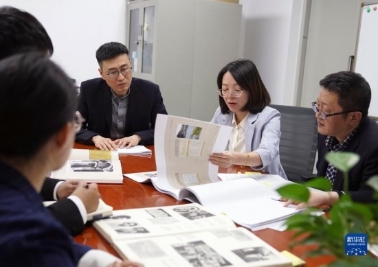 4月28日,在上海市檔案館的辦公室內(nèi),利用部工作人員方華(右二)和同事們討論策展工作的細(xì)節(jié)。