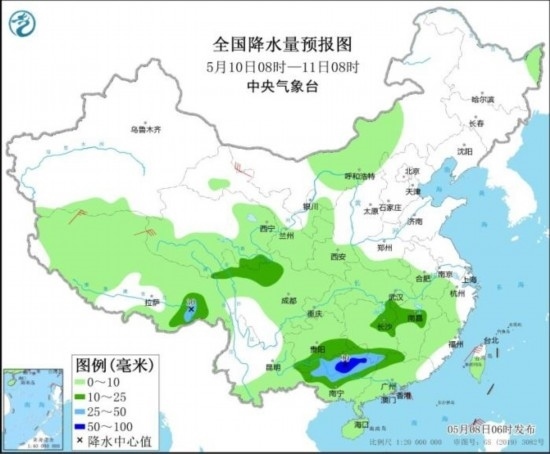 全國降水量預(yù)報圖(5月10日08時-11日08時)