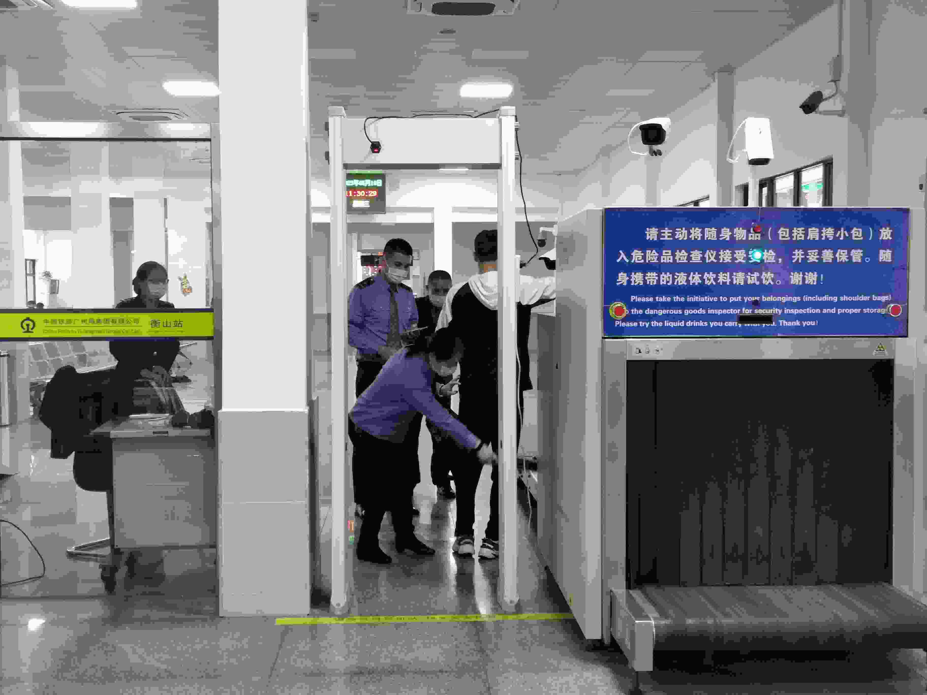 從整體的安檢流程來看,作為三等站的衡山站與其他火車站并無區(qū)別。澎湃新聞記者在這里發(fā)現(xiàn),進站口的安檢區(qū)域有兩臺X射線安檢儀,客流量不大時一般只使用一臺。旅客進站時,首先要經(jīng)工作人員檢驗身份證件,然后將攜帶的包裹等物品放入滾動的X射線安檢儀。旅客自己通過安檢門后,手持金屬探測器的工作人員會對其進行掃描檢查。