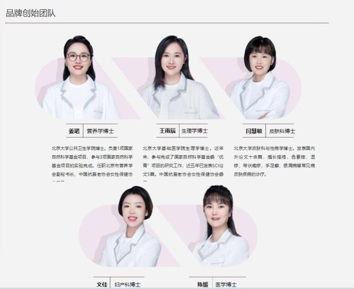“五個女博士”官網(wǎng)信息則宣傳,該品牌成立于2019年7月,由來自北京大學的五個醫(yī)學女博士聯(lián)合創(chuàng)立,官網(wǎng)首頁還放上了五人的簡介。其主要產(chǎn)品包括膠原蛋白肽維c飲品、每日亢唐植物飲品等。