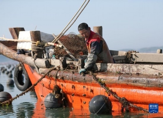 5月18日,廣鹿島鎮(zhèn)的漁民將生蠔苗投入海中。
