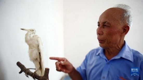 莫積瑞老人介紹白鷺標本的制作過程(5月20日攝)。