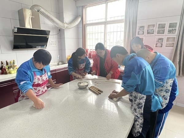 走進(jìn)陜西省渭南市特殊教育學(xué)校,手鼓聲、搟面聲、冰壺與地面摩擦聲此起彼伏;由教師扮演的“超市收銀員”正為“購物”的學(xué)生結(jié)賬;“自助取款機”前,幾位小朋友正排著隊學(xué)習(xí)如何存取現(xiàn)金;醫(yī)院“問診臺”、“掛號處”等模擬窗口應(yīng)有盡有……在這里,飽含愛心、耐心、責(zé)任心的教學(xué)態(tài)度和幫助特殊兒童自理、自立、自強的教育初衷滋養(yǎng)著每一名學(xué)生平安成長。