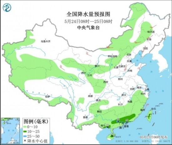 全國(guó)降水量預(yù)報(bào)圖(5月24日08時(shí)-25日08時(shí))