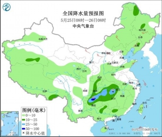 全國(guó)降水量預(yù)報(bào)圖(5月25日08時(shí)-26日08時(shí))