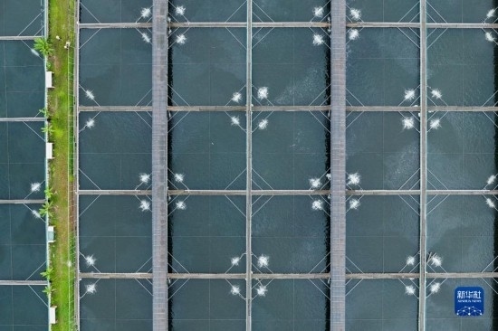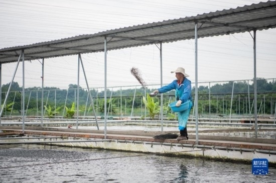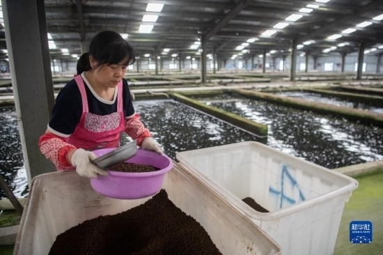 6月7日,中國(guó)清江(宜都)鱘魚(yú)谷工作人員在給鱘魚(yú)投喂餌料。