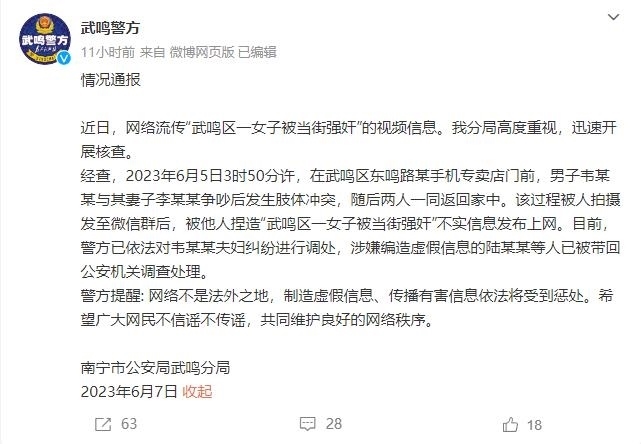·警方辟謠南寧一女子被當(dāng)街強(qiáng)奸:系夫妻吵架發(fā)生肢體沖突,造謠者已帶回調(diào)查處理。