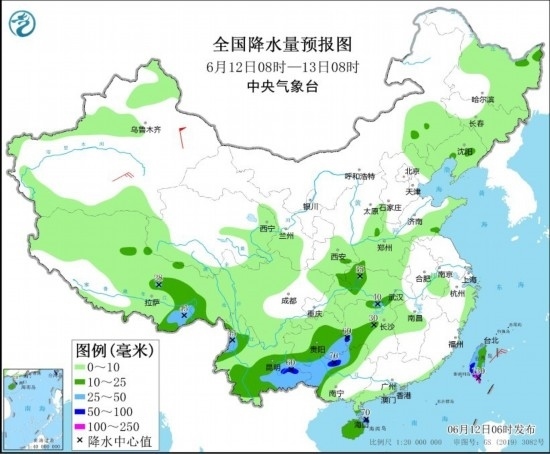 圖2 全國降水量預(yù)報圖(6月12日08時-13日08時) 圖片來源:中央氣象臺網(wǎng)站