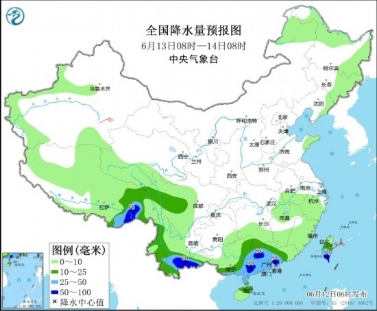 6月13日08時至14日08時,云南南部、廣西南部和東部、廣東大部、臺灣島中南部、西藏東南部等地有大雨,局部地區(qū)有暴雨(50~90毫米)。新疆東部等地有5~6級風(fēng)(見圖3)。
