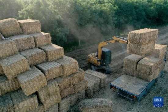 6月17日,河北邢臺南和區(qū)閻里鄉(xiāng)大郝村農(nóng)民將打捆的秸稈碼垛存放(無人機(jī)照片)。