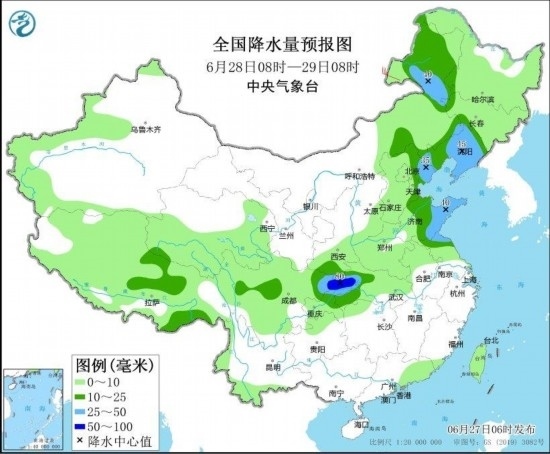 6月27日08時(shí)至28日08時(shí),甘肅東南部、陜西、四川盆地、內(nèi)蒙古中部和東北部、山西西部、黑龍江西部和東南部、吉林東北部、廣東東南部等地部分地區(qū)有中到大雨,其中,山西西部、陜西西南部、四川盆地北部等地部分地區(qū)有暴雨或大暴雨(100~110毫米)。西北地區(qū)東部、華北、江南東部、西藏南部等地部分地區(qū)有4~6級風(fēng),其中,內(nèi)蒙古西北部部分地區(qū)有6~7級風(fēng)(見圖2)。