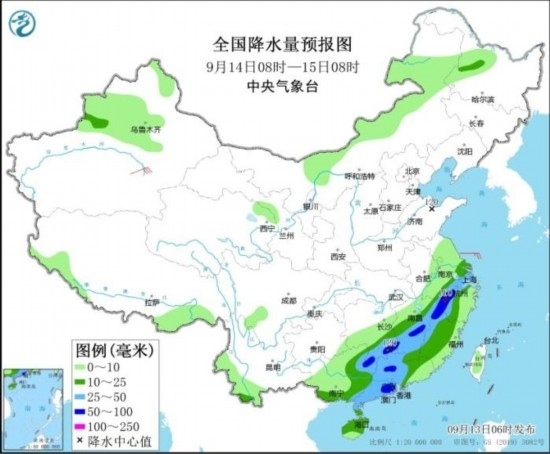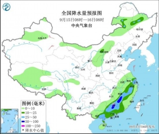 全國降水量預(yù)報圖(9月13日08時-14日08時)