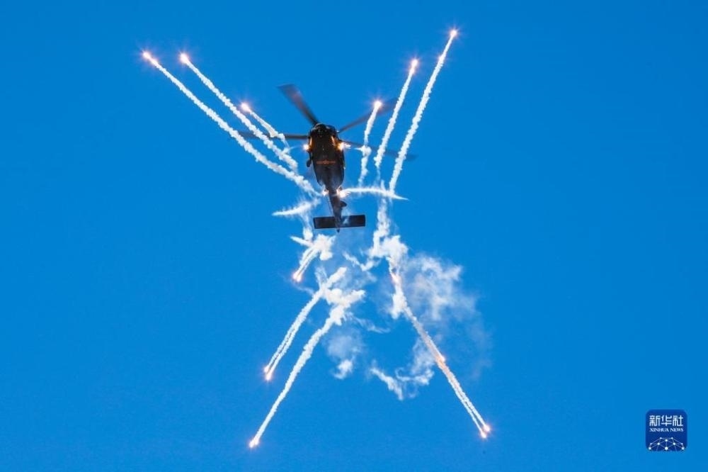 在第六屆中國(guó)天津國(guó)際直升機(jī)博覽會(huì)開(kāi)幕式上,陸軍“風(fēng)雷”飛行表演隊(duì)直-20戰(zhàn)術(shù)通用直升機(jī)發(fā)射干擾彈。?