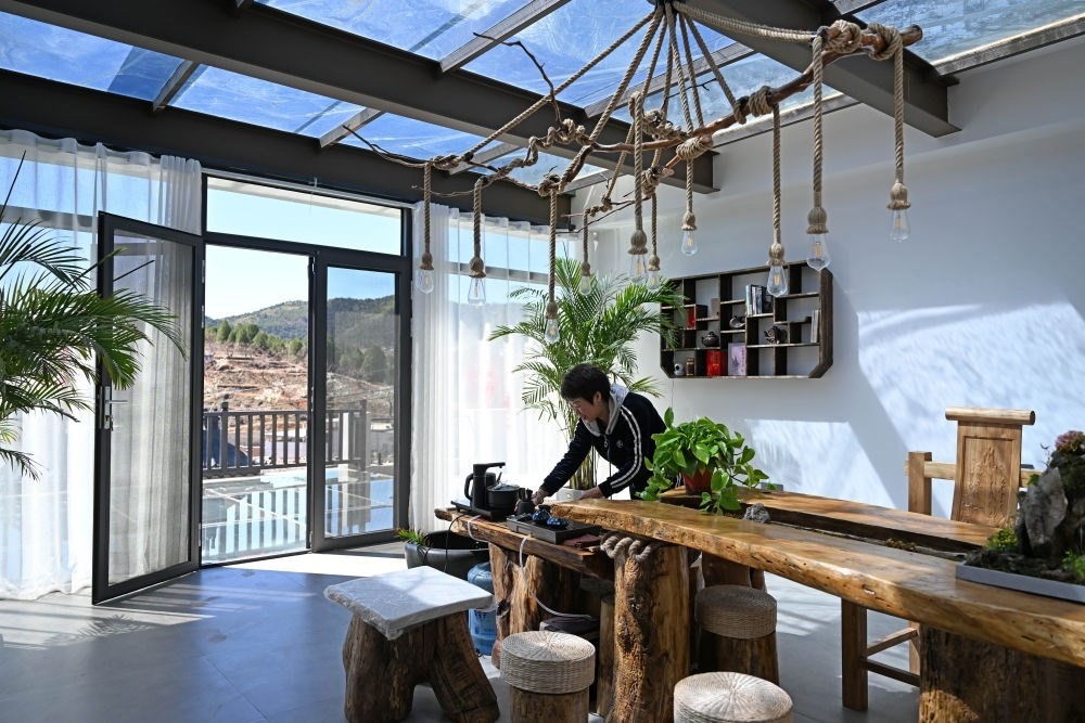 4月7日,天津市薊州區(qū)羅莊子鎮(zhèn)一家民宿的負(fù)責(zé)人在整理茶具。新華社記者 趙子碩 攝