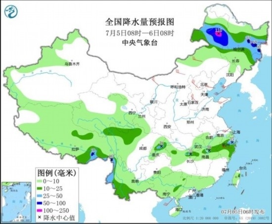 全國降水量預(yù)報(bào)圖(7月5日08時(shí)-6日08時(shí))。圖片來源:中央氣象臺(tái)網(wǎng)站