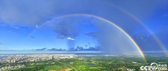 2023年7月9日,海口市天空出現(xiàn)雙彩虹,景色迷人。