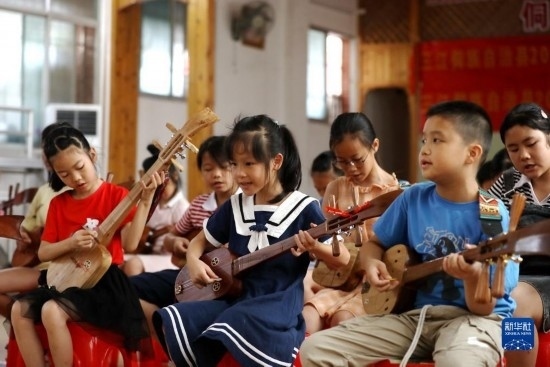 7月12日,在廣西三江侗族自治縣文化館,孩子們在彈唱琵琶歌。