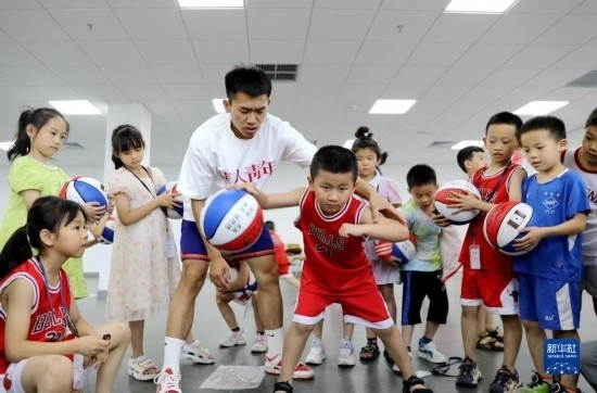 7月11日,在河南省濟(jì)源市,孩子們在老師的指導(dǎo)下練習(xí)籃球。