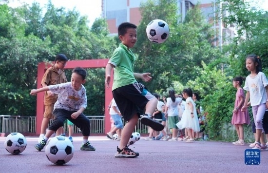 7月12日,孩子們在重慶市北碚區(qū)青少年活動中心踢足球。