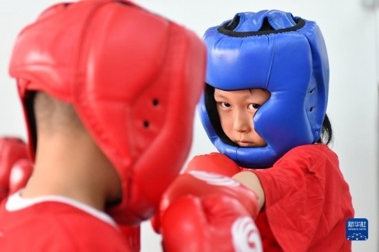 7月12日,小朋友在山東省煙臺市福山區(qū)一家搏擊訓(xùn)練館進(jìn)行搏擊訓(xùn)練。