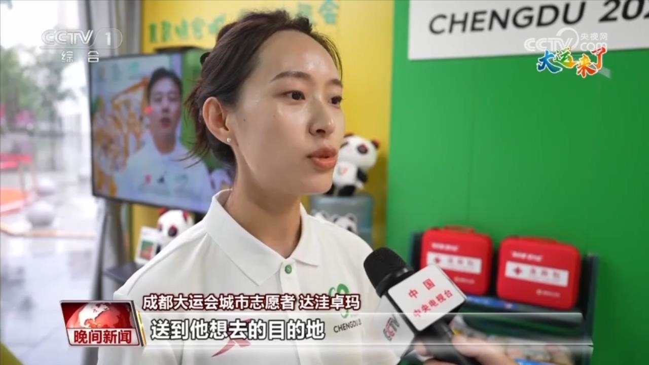 成都大運會城市志愿者 達洼卓瑪:來的人大部分是有一些應急的需求,躲雨或者借傘。像年齡大的人,我們可能還幫他去叫車,送到他想去的目的地。