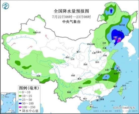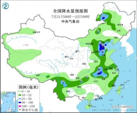 預(yù)計,7月21日08時至22日08時,內(nèi)蒙古東北部、河北東部、北京、天津、山東西北部、河南東南部、湖北東部、江西北部、四川南部等地部分地區(qū)有大到暴雨,其中,河北中部、北京東南部、天津南部等地局地有大暴雨(100~130毫米)。上述部分地區(qū)伴有短時強(qiáng)降水(最大小時降雨量20~50毫米,局地可超過60毫米),局地有雷暴大風(fēng)等強(qiáng)對流天氣。中央氣象臺7月21日06時繼續(xù)發(fā)布暴雨藍(lán)色預(yù)警。