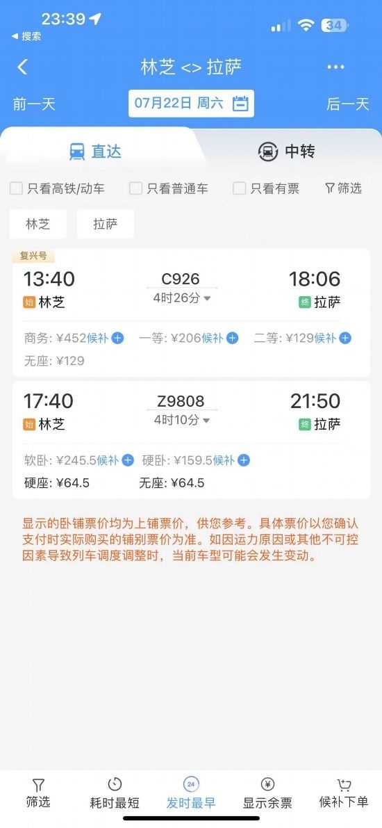 通過在鐵路售票APP上查詢發(fā)現(xiàn),從林芝開往拉薩的復(fù)興號城際列車的二等座票價為129元,直達特快列車硬座為64.5元?!跋啾容^原先180元的客運汽車票價,直達特快列車便宜了近乎三分之一?!辈芟壬锌卣f道。