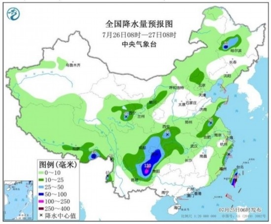 7月25日08時(shí)至26日08時(shí),重慶中南部、四川南部、云南東北部、貴州北部、湖南西北部、湖北西部以及江蘇北部、西藏東南部、臺灣島東部等地的部分地區(qū)有大到暴雨,其中,重慶東南部、四川南部、貴州北部等地局地有大暴雨(100~150毫米)(見圖3)。遼東半島、山東半島、浙江等地的部分地區(qū)有4~6級風(fēng);南海東北部、臺灣海峽有5~7級風(fēng),陣風(fēng)8~9級。