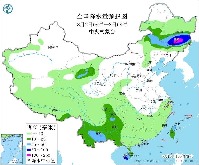 8月2日08時至3日08時,內(nèi)蒙古東部、黑龍江南部、吉林大部、青海北部、四川東部、貴州、云南、廣西西部、海南島、臺灣島等地部分地區(qū)有中到大雨,其中,黑龍江東南部、吉林中東部、海南島西南部等地局地有暴雨或大暴雨(100~150毫米)。遼寧中部、浙江北部等地部分地區(qū)有4~5級風(fēng)(見圖2)。
