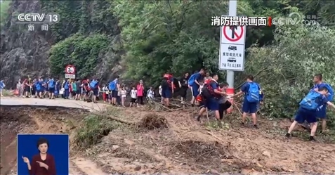 8月2日上午,現(xiàn)場總指揮決定護送自愿離開的被困群眾進行撤離。在撤離的隊伍中,有38名來自新疆參加北京游學的孩子,他們最小的6歲,平均年齡也只有8歲。為了保障轉移時的安全,撤離線路選擇了相對安全的盤山公路進行。途中經過落石塌方險區(qū)的時候,消防員們依次排開,在斷崖旁形成人墻,用身體筑起一條防線。遇到水流,消防員們把孩子們抱著傳遞到安全位置再繼續(xù)前行。