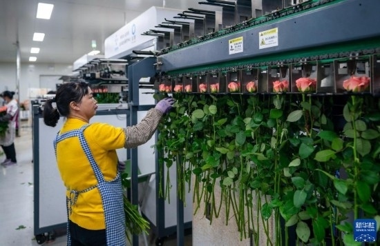 在云天化晉寧花卉產(chǎn)業(yè)現(xiàn)代化示范園內(nèi),花農(nóng)們將預(yù)冷處理后的鮮花放入自動(dòng)分揀流水線(7月12日攝)。新華社記者 崔文 攝