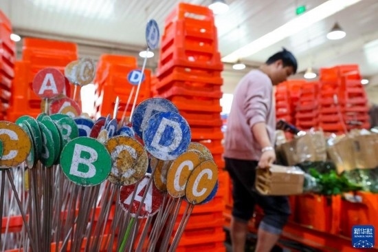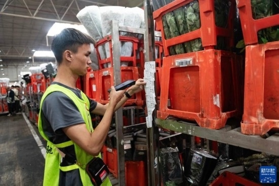 一名工作人員在昆明國(guó)際花卉拍賣交易中心內(nèi)對(duì)臺(tái)車上存放的鮮花進(jìn)行掃碼(7月13日攝)。新華社記者 陳欣波 攝