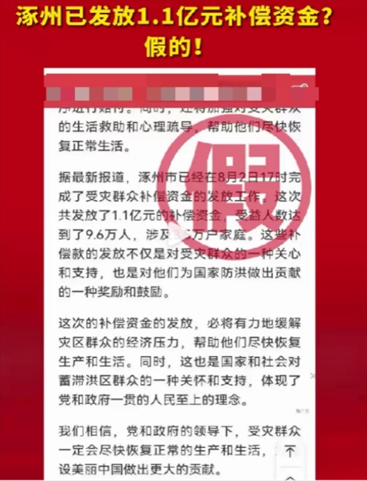 近日,網(wǎng)傳消息稱“河北省涿州市已經(jīng)在8月2日完成了1.1億受災(zāi)群眾補償資金的發(fā)放工作,受益人數(shù)達到了9.6萬人,涉及3.5萬戶家庭”。