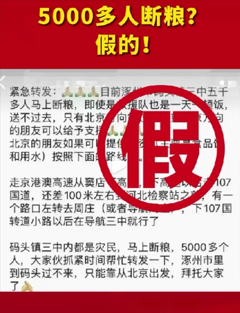 8月7日,“涿州發(fā)布”辟謠稱,網(wǎng)傳消息不實。同時,“涿州發(fā)布”還呼吁網(wǎng)民共同抵制網(wǎng)絡(luò)謠言。