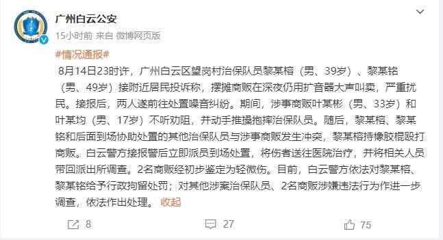 ·廣州警方通報治保隊員持棍打商販:處置噪音糾紛時發(fā)生沖突,2名治保隊員被行拘。