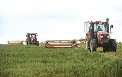鹽池縣農(nóng)戶在牧草基地開(kāi)展收割作業(yè)。 新華社記者 楊植森攝