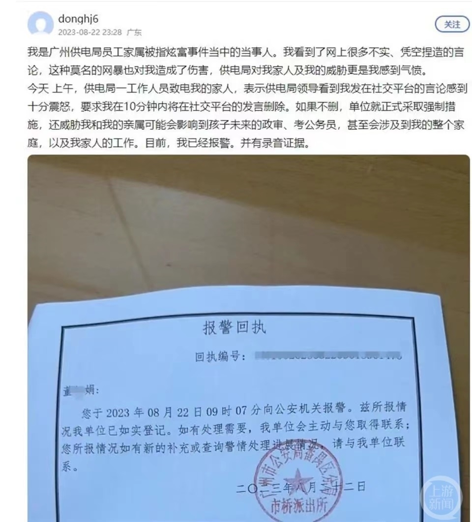 22日晚23時(shí),自稱是舉報(bào)當(dāng)事人阿娟的網(wǎng)友發(fā)布了報(bào)警回執(zhí),并發(fā)帖稱當(dāng)日上午,供電局一工作人員致電她的家人,“表示供電局領(lǐng)導(dǎo)看到我發(fā)在社交平臺(tái)的言論感到十分震怒,要求我在10分鐘內(nèi)將在社交平臺(tái)的發(fā)言刪除。如果不刪,單位就正式采取強(qiáng)制措施,還威脅我和我的親屬,(此舉)可能會(huì)影響到孩子未來的政審、考公務(wù)員,甚至?xí)婕暗轿业恼麄€(gè)家庭,以及我家人的工作。目前,我已經(jīng)報(bào)警。并有錄音證據(jù)?!?/p>
