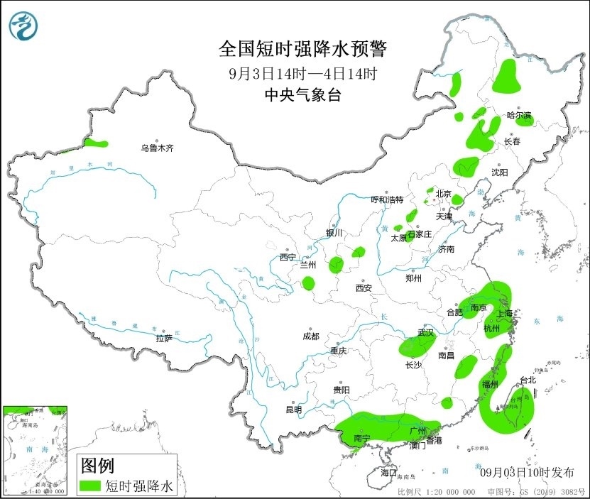 預計9月3日14時至4日14時,內(nèi)蒙古東南部、吉林西部、遼寧西部、山西中部、河北中部和東北部以及福建東部和西北部、廣西南部和東南部沿海、臺灣島等地的部分地區(qū)將有8-10級雷暴大風或冰雹天氣,局地可達11級以上;內(nèi)蒙古東部、黑龍江西部、吉林西部、遼寧西部、甘肅南部、山西中部、河北西部和東北部、江蘇中南部、安徽東部、上海、浙江北部、福建東部和西北部、廣西南部、廣東西南部、臺灣島等地的部分地區(qū)將有短時強降水天氣,最大小時雨量20-50毫米,局地可達70毫米以上。