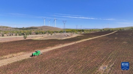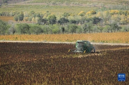 10月1日,在沽源縣白土窯鄉(xiāng)小西溝村,當?shù)剞r(nóng)機手在操作收割機收獲藜麥。