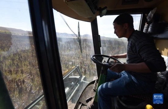 10月1日,在沽源縣白土窯鄉(xiāng)小西溝村,當?shù)剞r(nóng)機手王永成在操作收割機收獲藜麥。