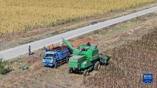 10月1日,在沽源縣白土窯鄉(xiāng)小西溝村,當?shù)剞r(nóng)機手將藜麥裝車裝備外運(無人機照片)。
