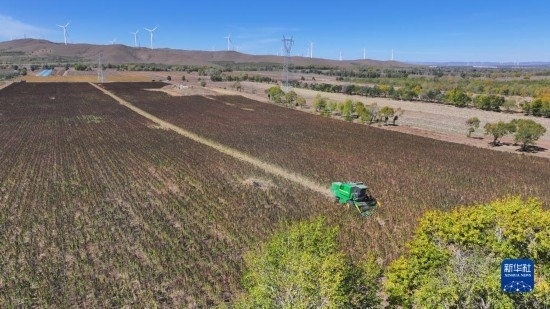 10月1日,在沽源縣白土窯鄉(xiāng)小西溝村,當?shù)剞r(nóng)機手在田間操作收割機收獲藜麥(無人機照片)。