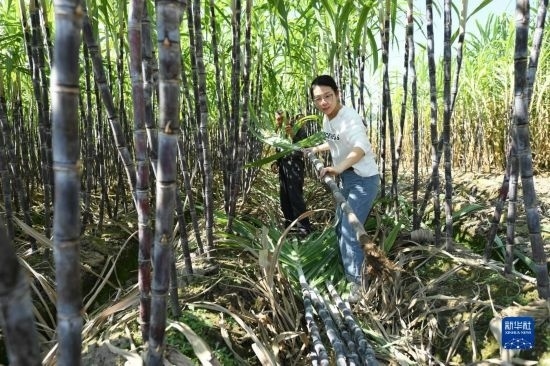 10月18日,在浬浦鎮(zhèn)外浦村的甘蔗田里,志愿者幫助農(nóng)戶收獲果蔗。