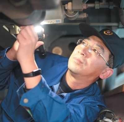 時而膝蓋微弓,腰部略彎;時而敲敲打打,上前細(xì)嗅……只見劉波進(jìn)車廂、鉆車底、登車頂,對列車逐一進(jìn)行檢查,不一會兒,動車隱患就被及時發(fā)現(xiàn)并排除。
