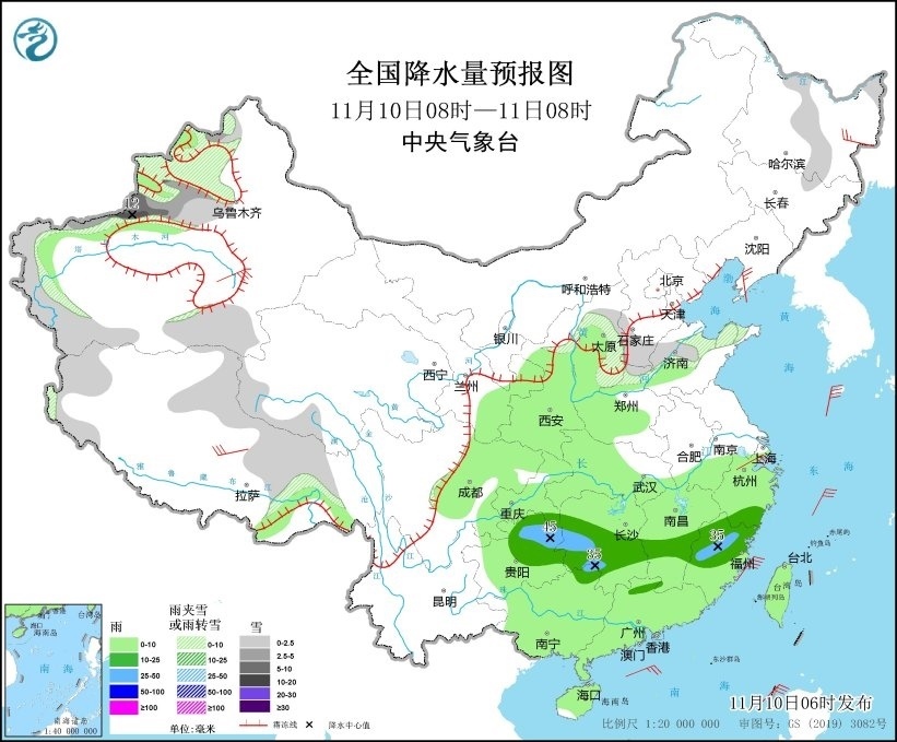 11月10日08時(shí)至11日08時(shí),新疆西部和南疆南部、西藏西部和北部、青海南部、黑龍江東部、吉林北部、山西北部、河北南部、山東西部等地部分地區(qū)有小到中雪或雨夾雪,其中,新疆伊犁河谷和沿天山一帶等地部分地區(qū)有大雪,局地暴雪(10~12毫米)。重慶東南部、貴州東部和北部、湖南中南部、江西中南部、浙江南部、福建中北部以及廣西東北部等地部分地區(qū)有中雨,其中,貴州東北部、湖南西部、福建西北部等地部分地區(qū)有大雨(25~45毫米)。黑龍江東北部、遼東半島、新疆南疆盆地、西藏北部、浙江北部等地部分地區(qū)有4~6級(jí)風(fēng)(見(jiàn)圖4)。