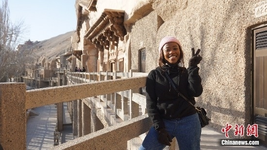 圖為萊索托留學(xué)生茉莉在敦煌莫高窟進行參觀。受訪者供圖