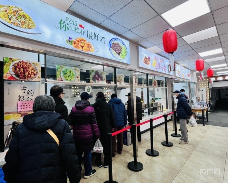 天津市和平區(qū)南營門街道老人家食堂內,老人們排隊就餐(央廣網記者 褚夫晴 攝)